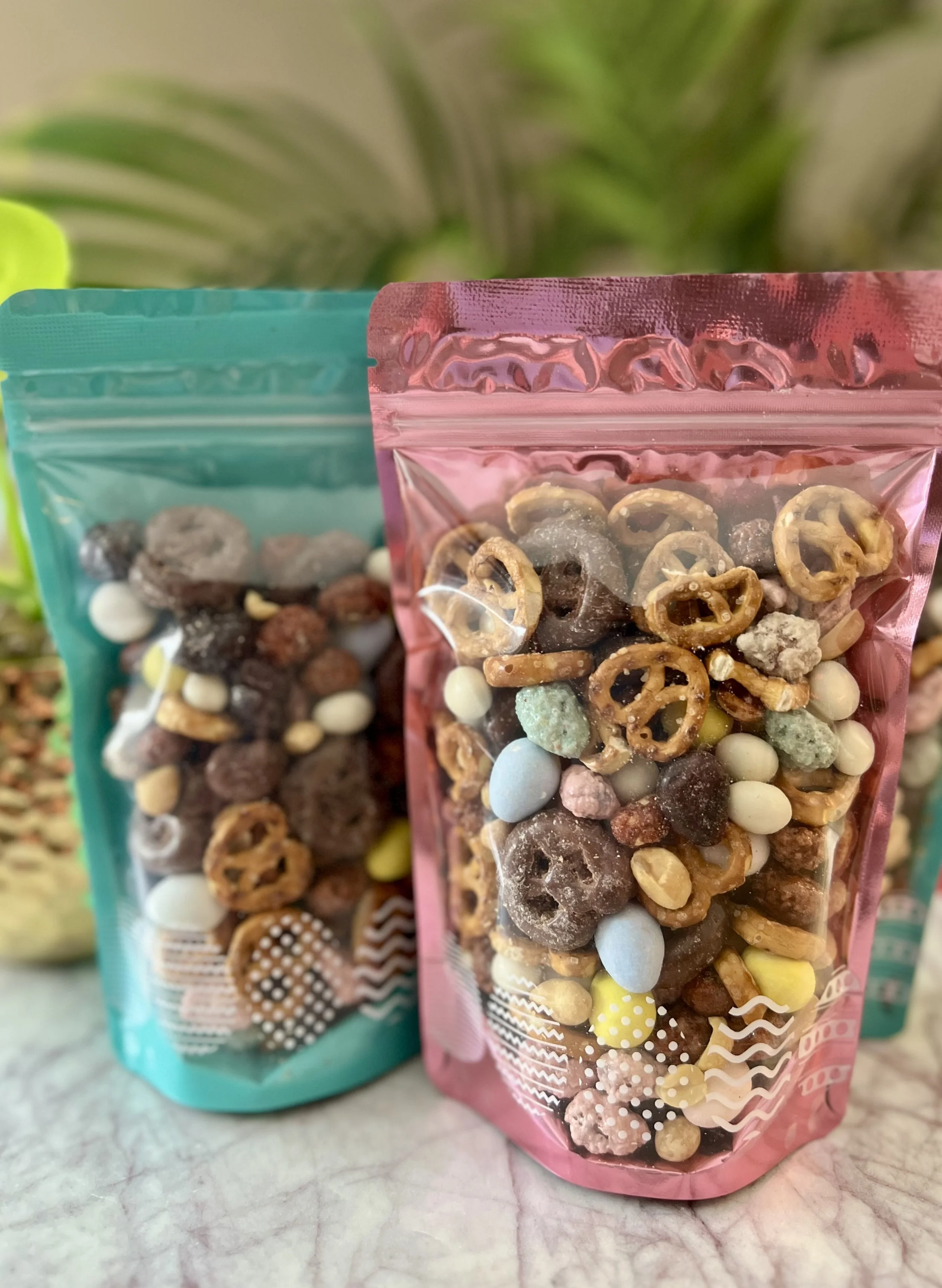 A perfect balance of both sweet and salty and just in time for Easter! Chocolate Pretzels, Chocolate Eggs, Beer Nuts, Salted Caramel Almonds, Yogurt Raisins, Dark Chocolate Raisins, Salted Peanuts, Pretzels.